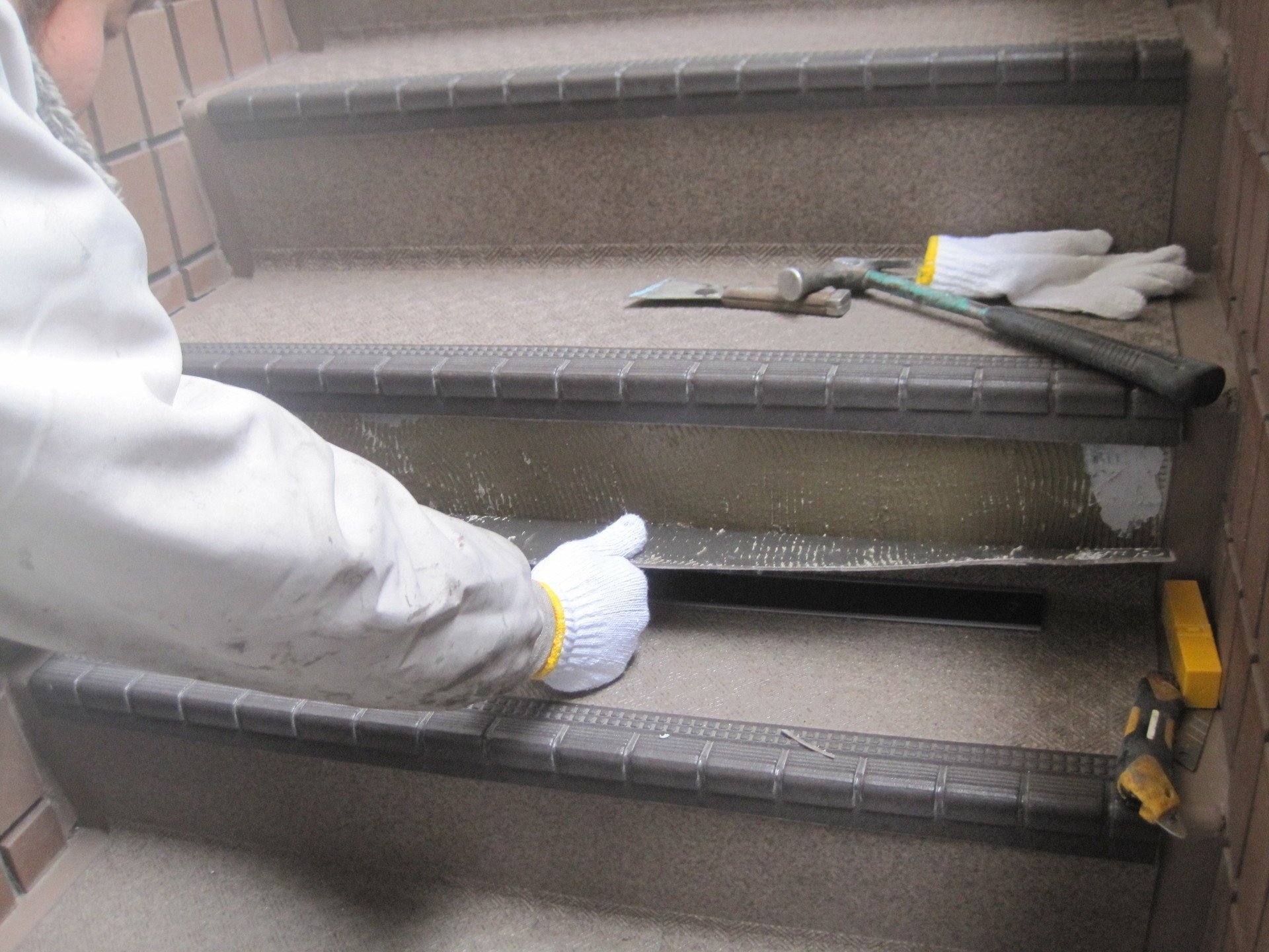 共用の階段や廊下部分には、長尺シートと呼ばれるプラスチック製のシート工事が用いられることがあります